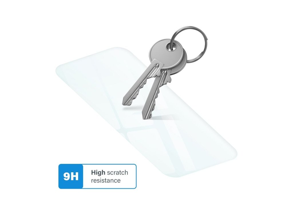 - Základné tvrdené ochranné sklo, ktoré je priehľadné po celej ploche (bez čiernych rámčekov). Výhoda je jeho kompatibilita s krytmi, ktoré sú až za hranu displeja (Pitaka, Quad Lock).