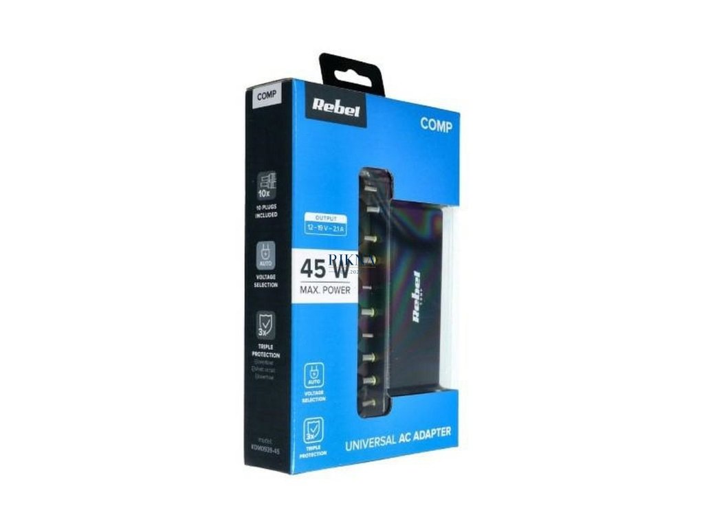 Univerzálny napájací adaptér REBEL s 10 koncovkami, 45 W. Vhodný pre väčšinu populárnych modelov notebookov.