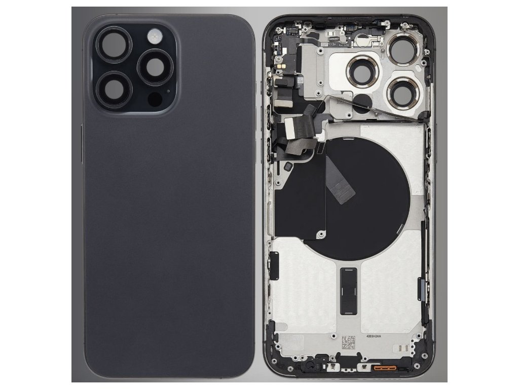 Zadné sklo + rám (vytiahnutý A) - čierny s dielmy (okrem nabíjania, repoduktora a vibrátoru) pre iPhone 15 Pro Max BLACK TITANIUM